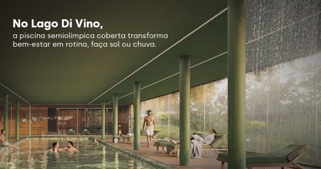 Enquanto a cidade muda de humor com o céu, a rotina no Lago Di Vino permanece impecável. A piscina coberta aquecida integra o conjunto de ambientes do pavimento térreo do Clubhouse, ao lado de SPA, sala de massagem e saunas úmida e seca, formando um verdadeiro núcleo de wellness dentro do condomínio.