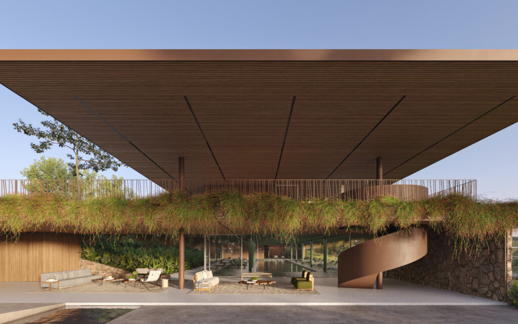 Responsável pelo paisagismo, Daniel Nunes reforça a proposta de imersão natural. “Para este projeto, optamos pelo efeito reverso: não é o jardim do empreendimento, é o empreendimento que está inserido dentro de um grande jardim, com arborização de árvores de diversas espécies”.